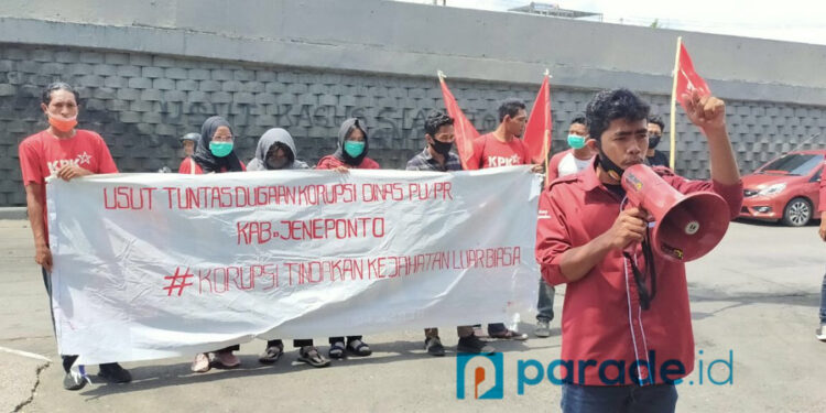 Makassar (PARADE.ID)- Sejumlah orang yang mengatasnamakan Komite Pejuang Kerakyatan siang tadi melakukan aksi unjuk rasa terkait adanya dugaan kasus KKN dan mark up anggaran pembangunan trotoar jalan oleh Dinas Pekerjaan Umum dan Perumahan Rakyat (PUPR) Kab. Jeneponto yang didukung oleh Kuasa Pengguna Anggaran.