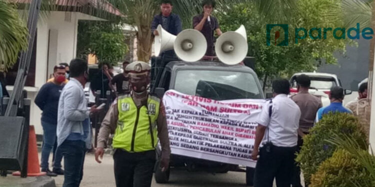 Kendari (PARADE.ID)- Sejumlah orang yang mengatasnamakam Front Aktivis Hukum dan HAM Sultra siang tadi melaksanakan aksi unjuk rasa terkait adanya dugaan pencabulan anak di bawah umur yang dilakukan oleh Wakil Bupati Buton Utara. Namun dengan status kasusnya yang sudah tersangka dan yang bersangkutan masih leluasa berkeliaran di luar.