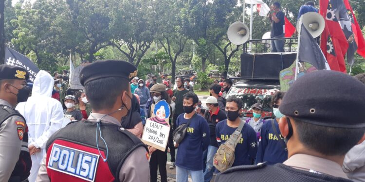 Jakarta (PARADE.ID)- Koalisi Rakyat Menolak Penggusuran (KRMP) menggelar aksi demonstrasi, untuk menuntut pencabutan Peraturan Gubernur (Pergub) Provinsi DKI Jakarta Nomor 207 tahun 2016 tentang Penertiban Pemakaian/Penguasaan Tanah Tanpa Izin yang Berhak (Pergub DKI 207/2016), di Balai Kota, Jakarta Pusat, DKI Jakarta.