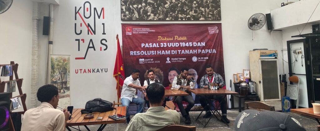 Jakarta (parade.id)- Eksekutif Nasional Liga Mahasiswa Nasional untuk Demokrasi (EN LMND) menggelar diskusi publik bertajuk “Pasal 33 UUD 1945 dan Resolusi HAM di Tanah Papua” pada Jumat (13/3/2026) di Jakarta. Diskusi menghadirkan tiga narasumber: Alfred Pabika selaku aktivis Papua, Betrand Sulani dari Departemen Hukum dan HAM LMND, serta Ramos perwakilan dari Gerakan Mahasiswa Nasional Indonesia (GMNI).