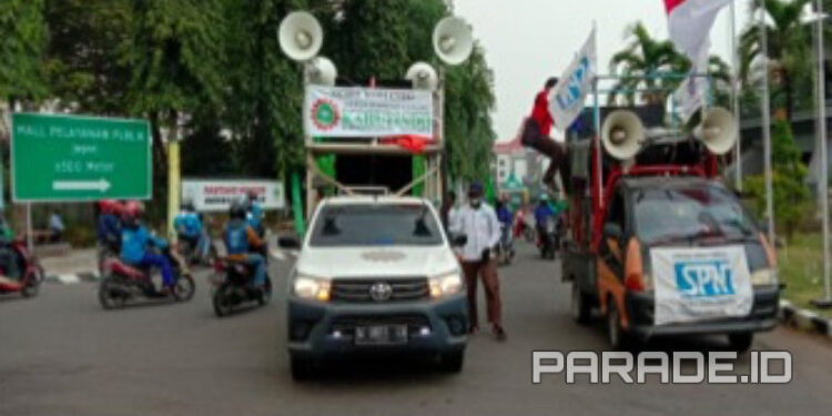 Gresik (PARADE.ID)- Ratusan massa buruh yang tergabung dalam Presidium Serikat Bersama Gresik (Sekber) Kab. Gresik, Jawa Timur, menggelar aksi unjuk rasa damai tolak Omnibus Law di Kantor Pemerintahan Kabupaten (Pemkab) Gresik, Rabu (29/7/2020).