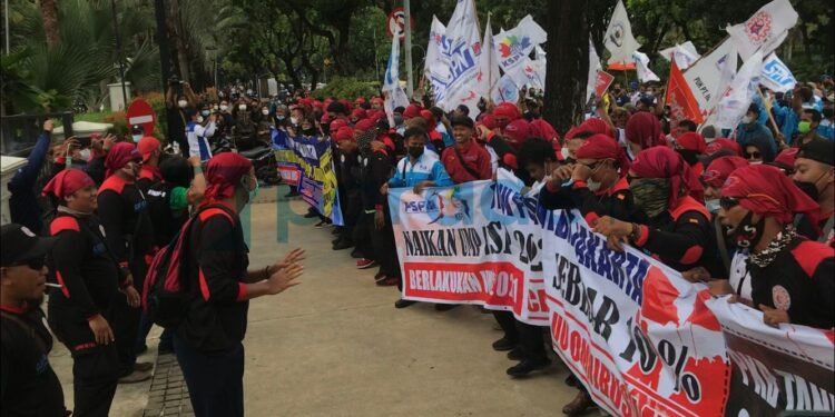 Jakarta (PARADE.ID)- Ratusan buruh yang tergabung dalam Konfederasi Serikat Pekerja Indonesia (KSPI) menantang Gubernur DKI Jakarta Anies Rasyid Baswedan untuk menetapkan upah minimun provinsi (UMP) di luar PP 36, turunan dari UU Cipta Kerja.